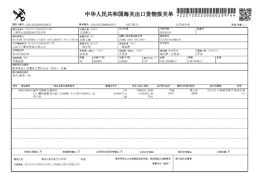 上周,肯尼亞Sosian地熱電站兩臺螺桿蒸汽膨脹發電機組啟運上海羅涇港。今天,完成海關報關作業,不日就將裝船發運肯尼亞蒙巴薩港。
